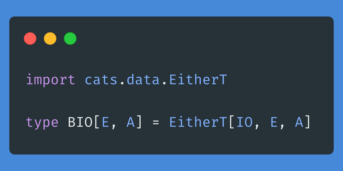 type BIO[E, A] = EitherT[IO, E, A]